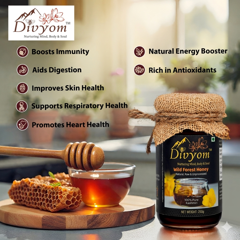 Discover the unparalleled quality of Divyom Kashmiri Wild Forest Honey, a premium, pure honey sourced from the pristine valleys of Kashmir. Collected by honeybees from the nectar of diverse wild forest flowers, herbs, shrubs, and trees.
