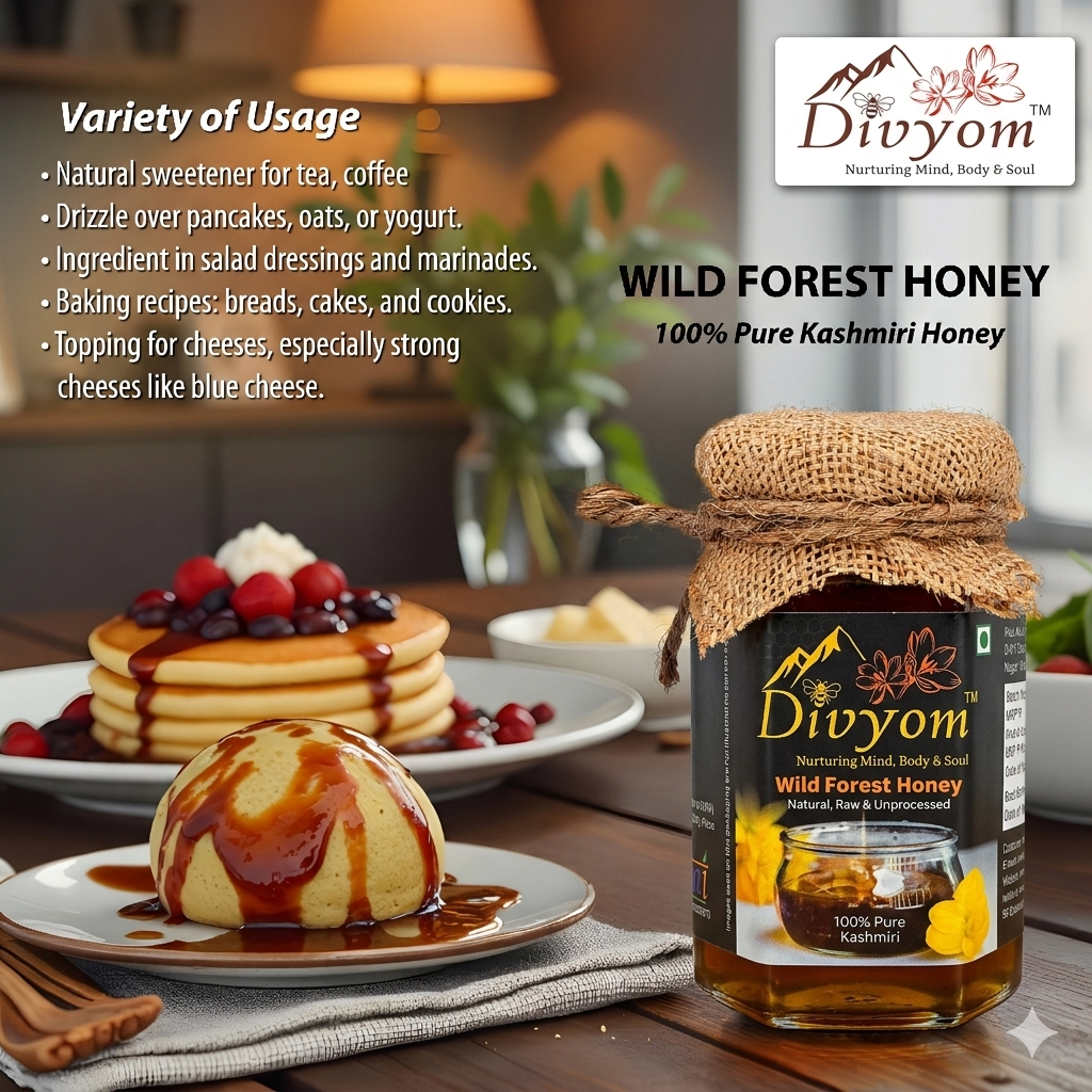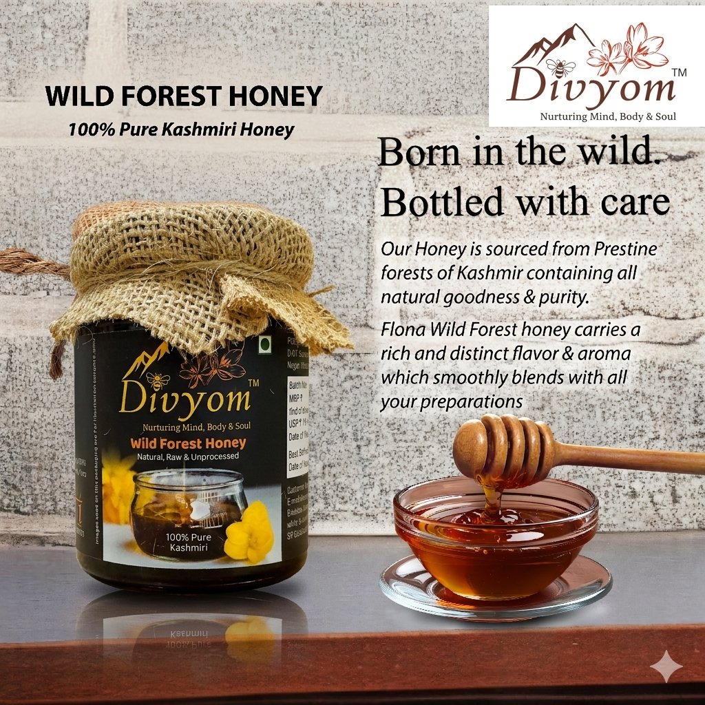 Discover the unparalleled quality of Divyom Kashmiri Wild Forest Honey, a premium, pure honey sourced from the pristine valleys of Kashmir. Collected by honeybees from the nectar of diverse wild forest flowers, herbs, shrubs, and trees.